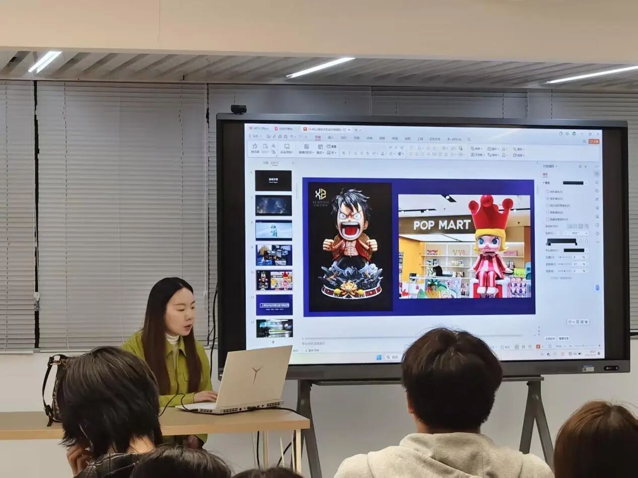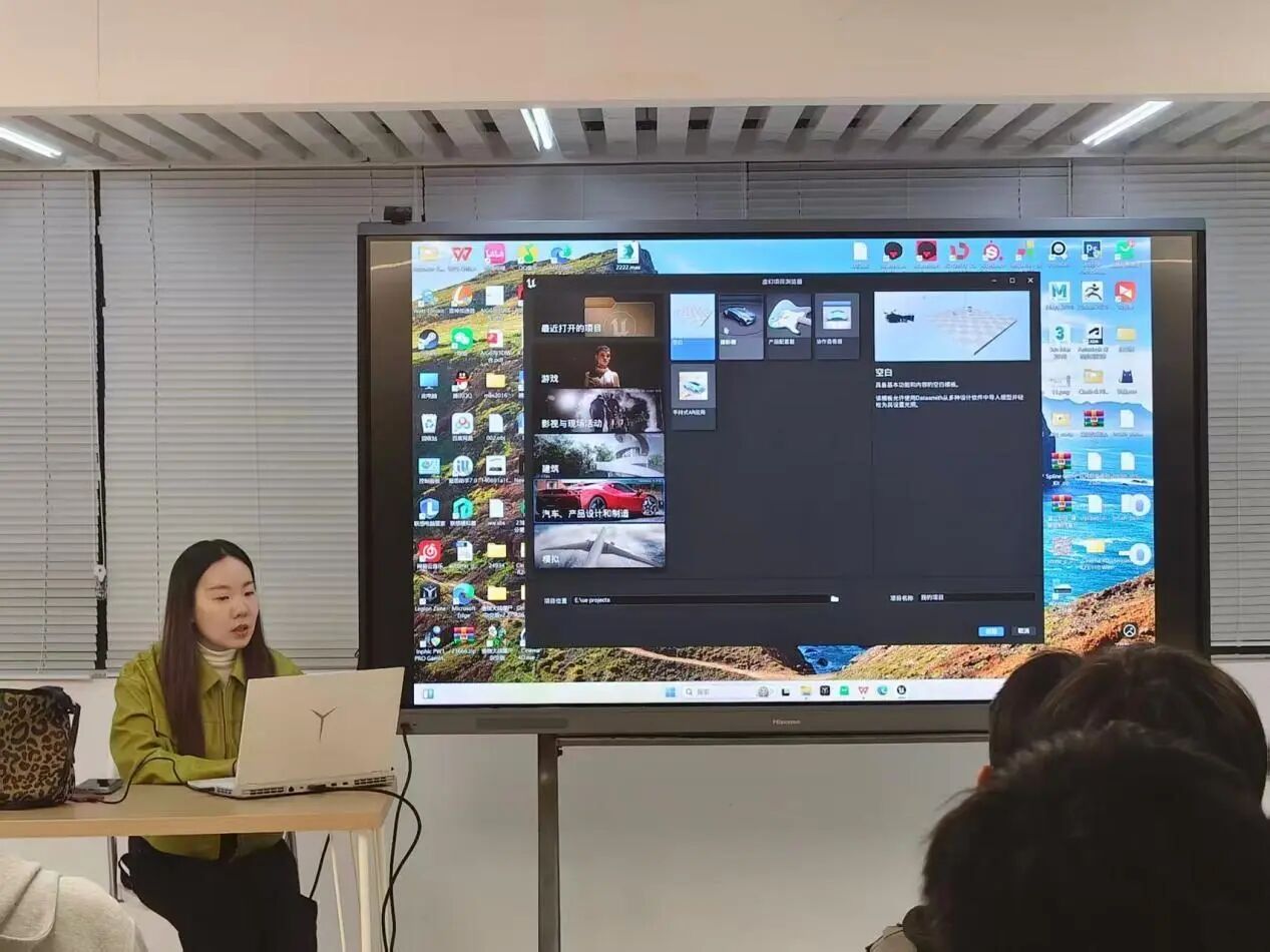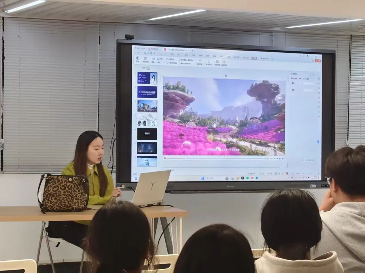 讲座伊始,童老师并未直接切入技术细节,而是以一段《无限暖暖》的游戏实机演示片段暖场。视频中,角色服装的面料质感、光影变化下的皮肤细节以及与场景互动时的物理反馈,都做得极为逼真。“大家可以猜猜,这段视频背后至少涉及了哪几个设计岗位?”她笑着抛出问题,瞬间点燃了现场气氛。同学们踊跃发言,从“角色建模师”到“材质艺术家”,答案五花八门,童老师一一点评,并顺势引出本次讲座的核心:“三维技术早已不是简单的‘画个立体图’,而是一套能让创意‘活’起来的完整体系。”