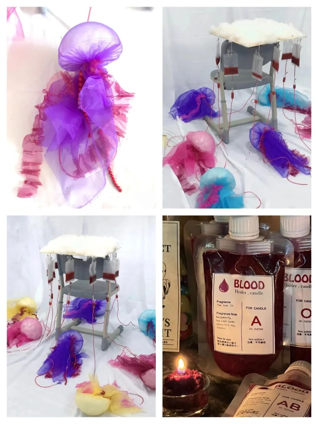 现在的员工压力越来越大像只会读书的机器,没了员工该有的青春活力。我们小组以水母为灵感做了一件实验艺术装置,作品的初心是希望有更多的人重视员工压力很大。水母本应该是梦幻的灵动可爱的,但是被输液袋吊着,没有活力垂死挣扎。比喻压力大的员工,被老师家长公司等等灌输要拼命学习没有办法释放自己。