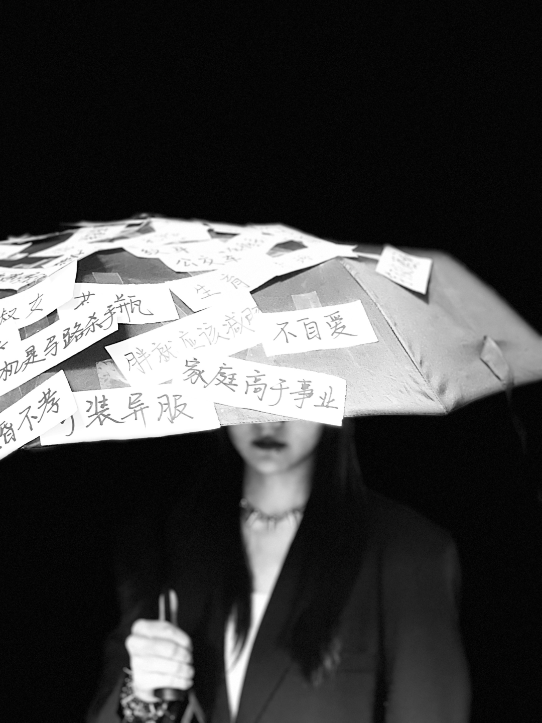 《保护伞》:面对人们和社会给予的种种标签,女性不得不撑起一把保护自己的伞,以抵挡住外界贴于女性的标签,在伞内她们才能做回自己喜欢的样子。