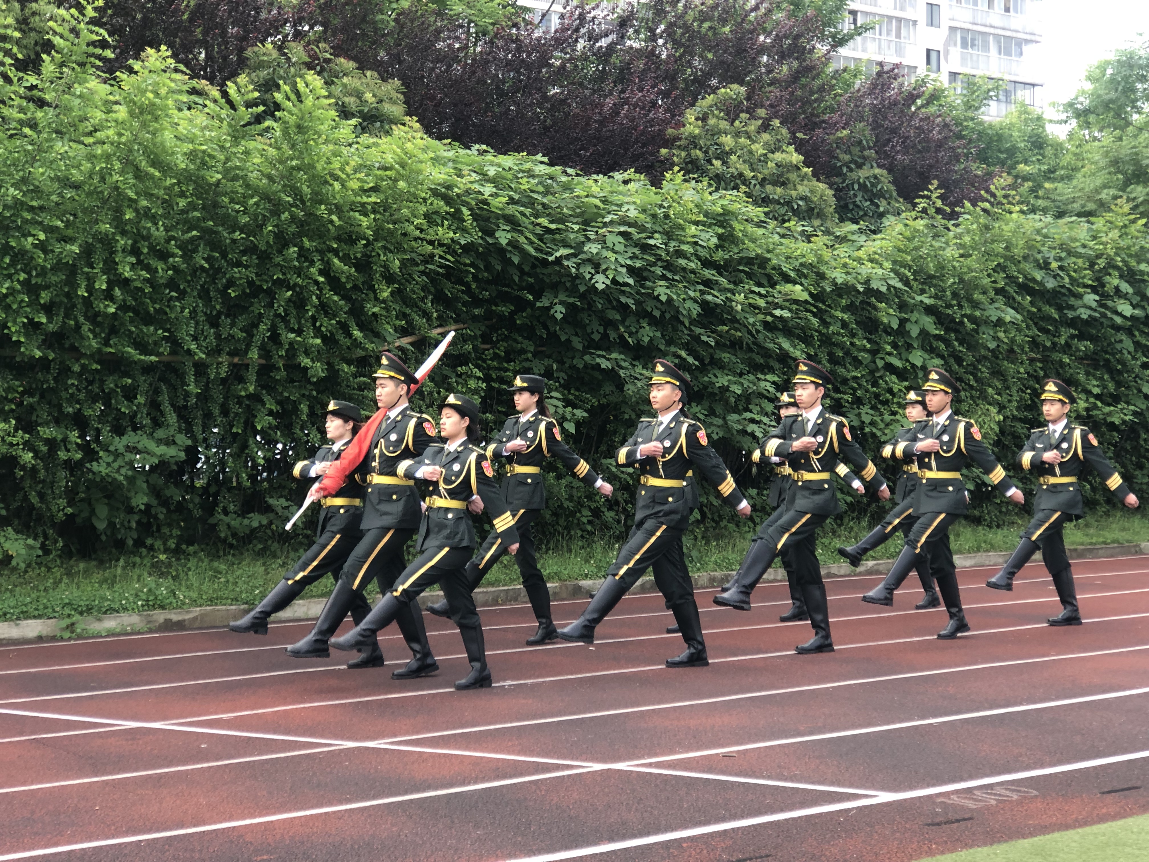 旗手们着装整齐,迈着矫健的步伐,护着鲜艳的五星红旗入场举行升旗仪式,伴随着庄严的国歌,五星红旗冉冉升起,迎风飘扬。在场众人向国旗行注目礼,深怀对祖国无限的热爱和崇高的敬意。