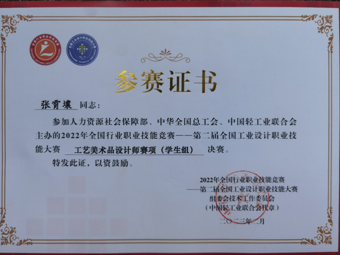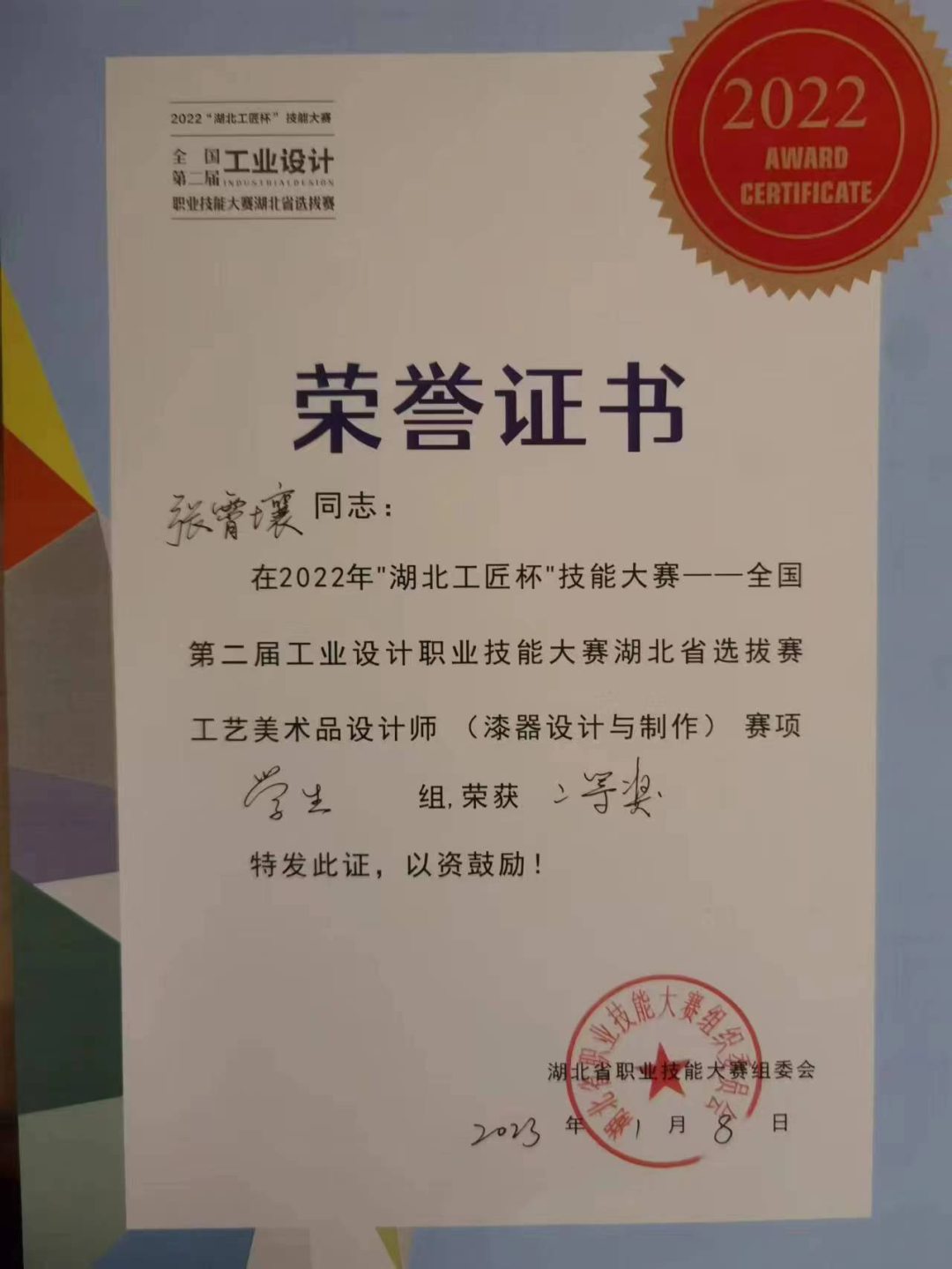 其中张霄壤同学也曾于2023年1月7日参加“第二届全国工业设计职业技能大赛”省赛,获省级员工组二等奖佳绩,作为湖北省赛区参赛代表参加2023年2月27日广州“湖北工匠杯——第二届全国工业设计职业技能大赛总决赛”。