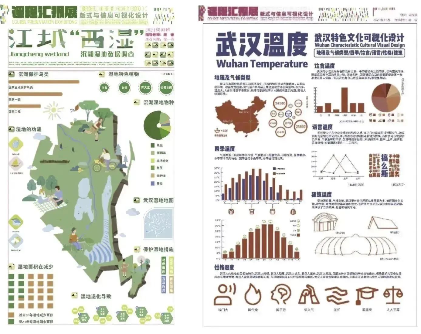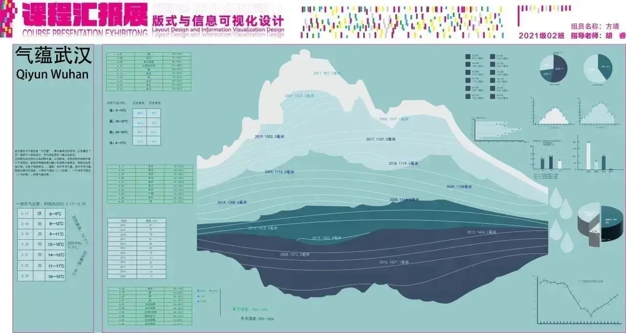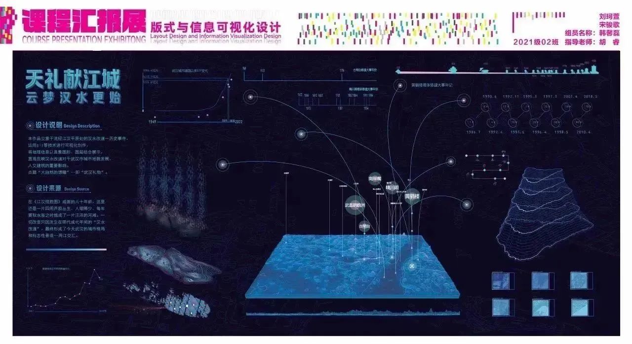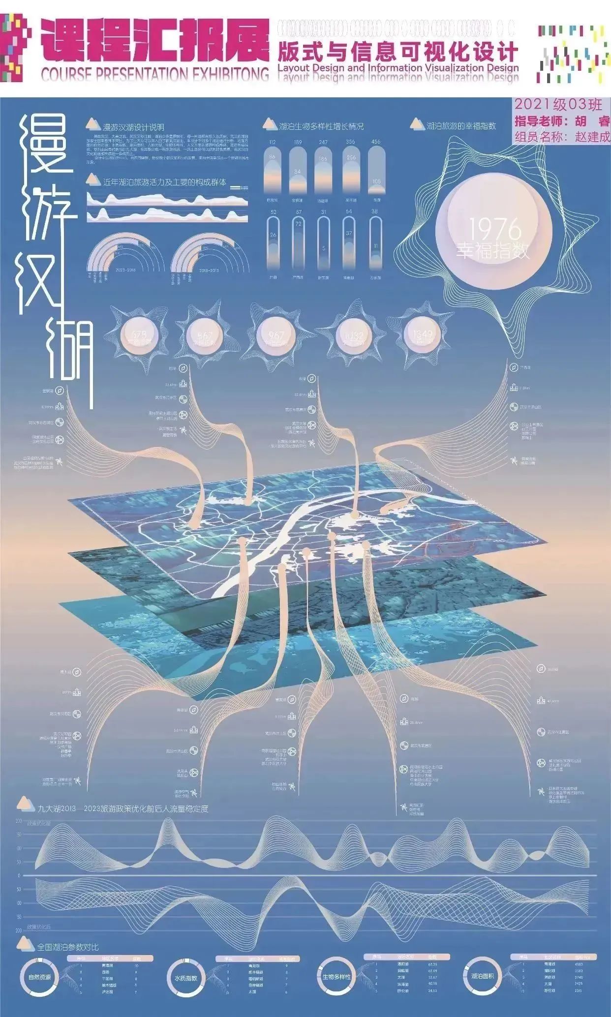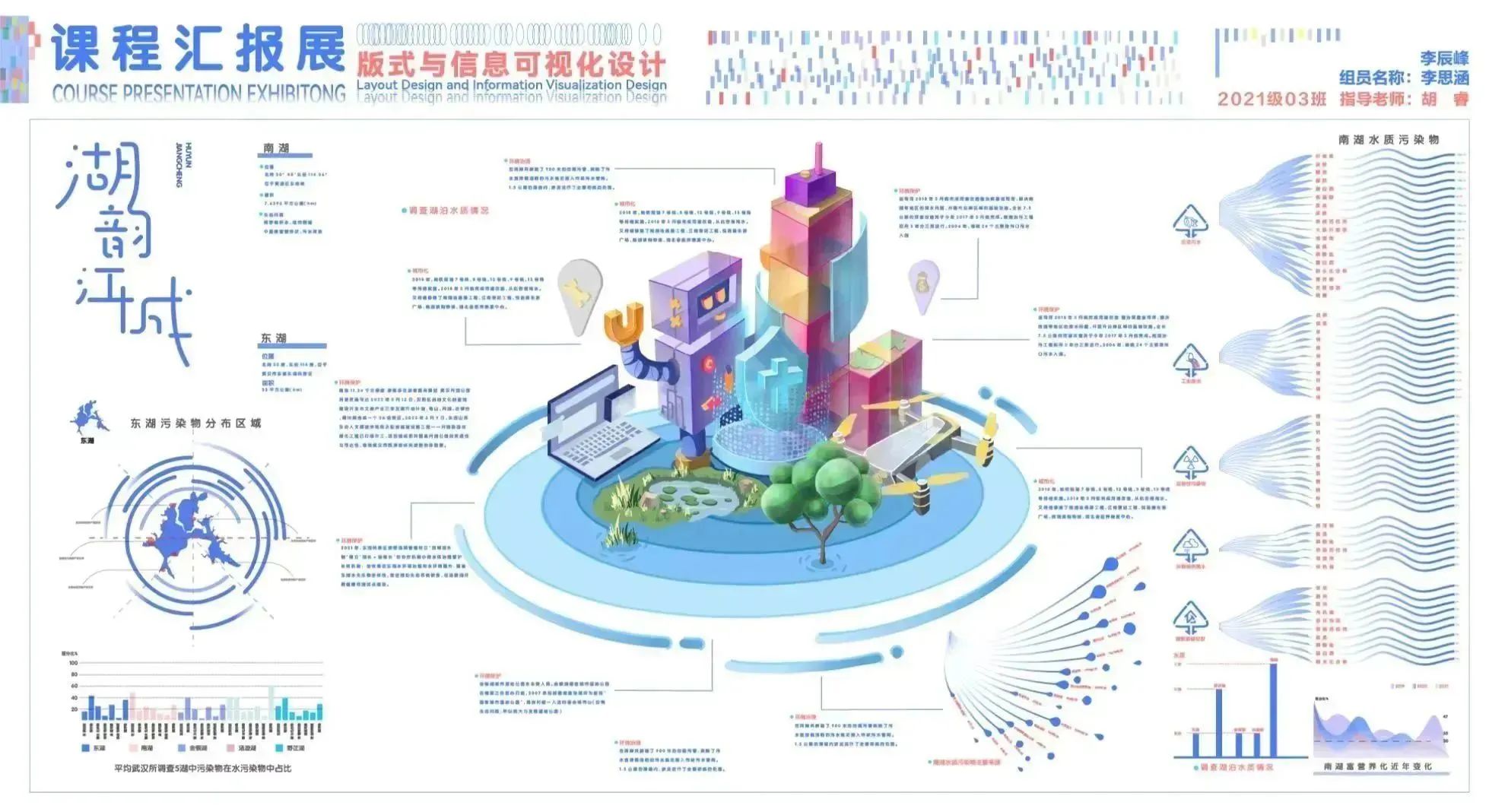 设计说明:武汉湖泊周边建筑展示智能化管理,关注生态保护。设计以科技潮流为主,体现城市发展。重点展示武汉作为“百湖之市”和亚洲最大城中湖。水是主题,图表呼吁环保和保护湖泊水质。