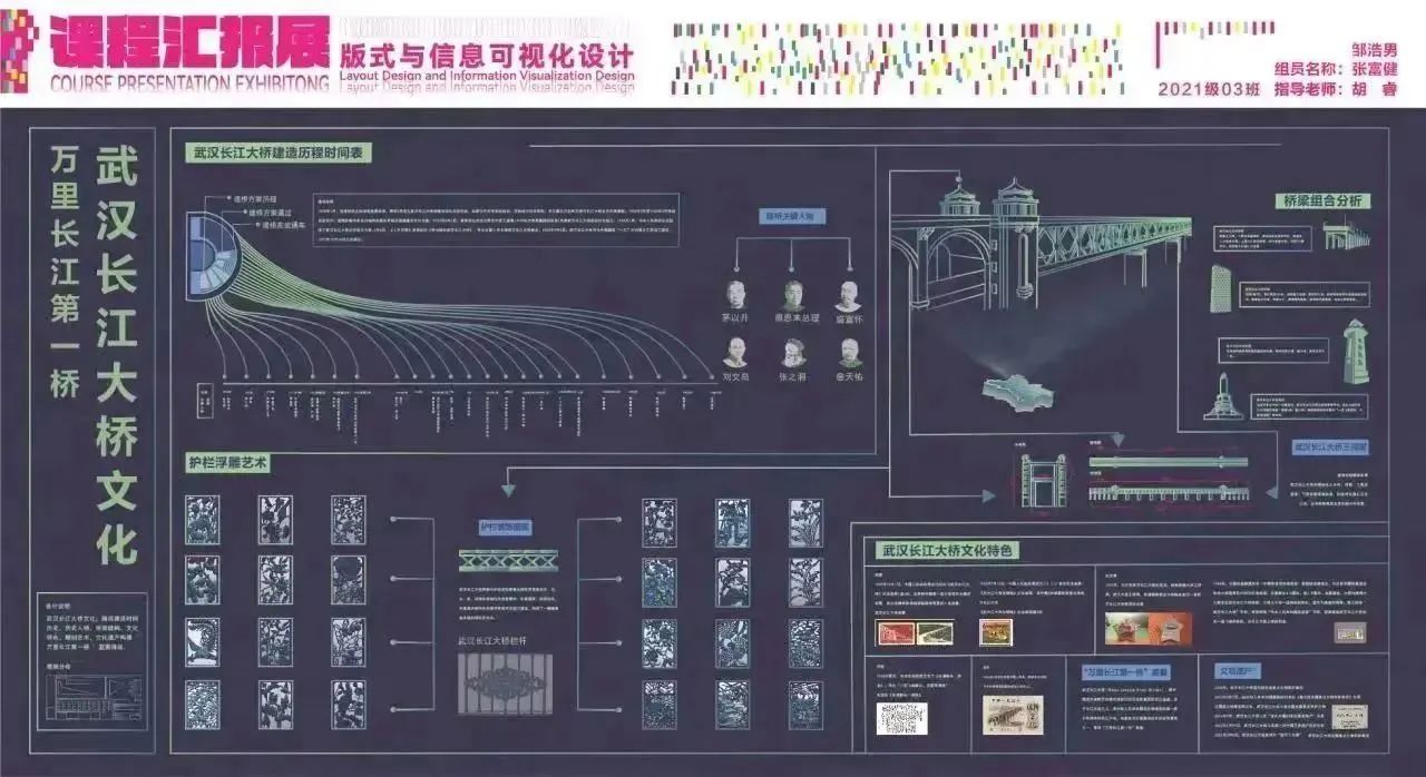 设计说明:武汉长江大桥文化,围绕建设时间历史,历史人物,桥梁结构,文化特色,雕刻艺术,文化遗产构建"万里长江第一桥“蓝图排版。