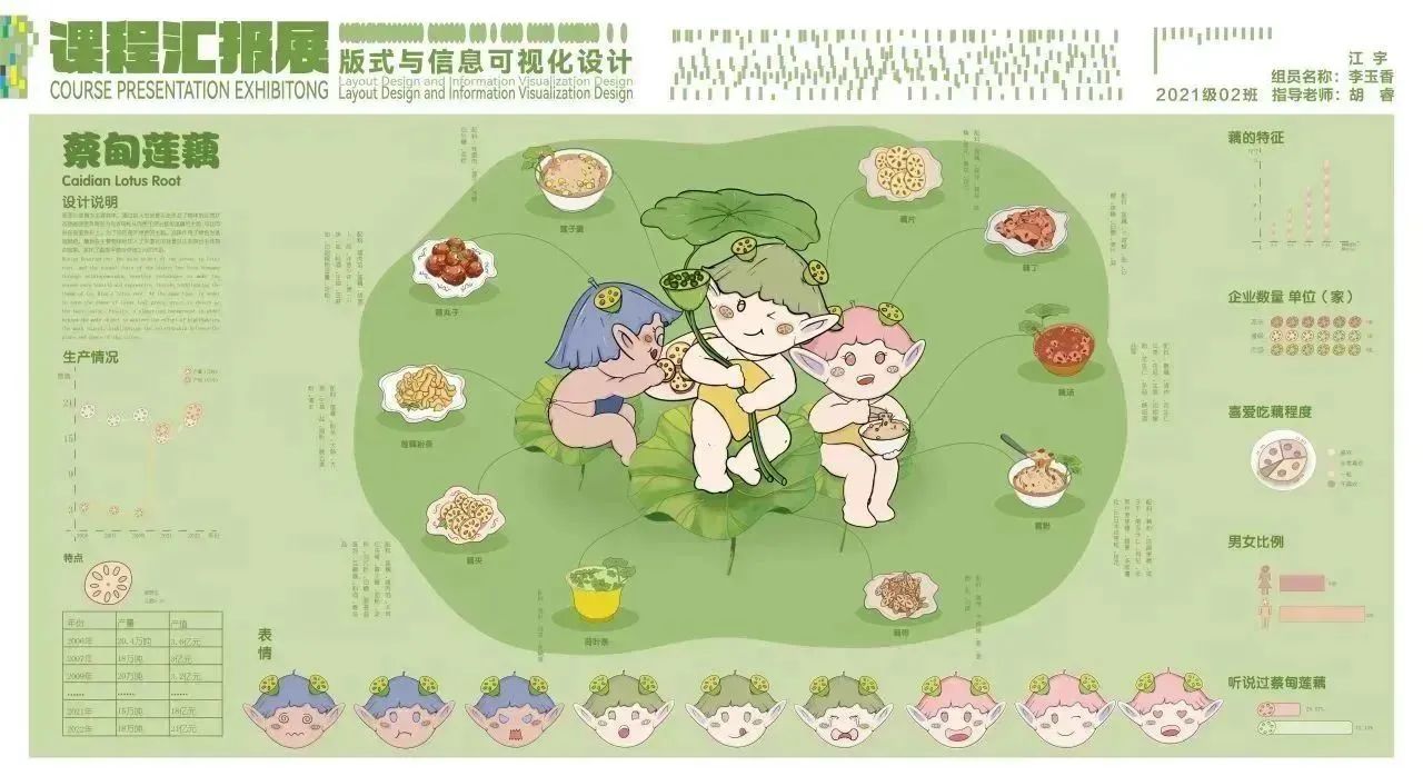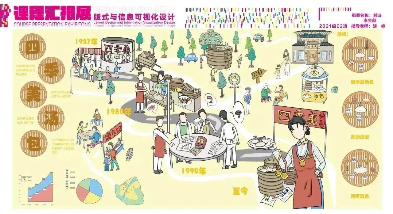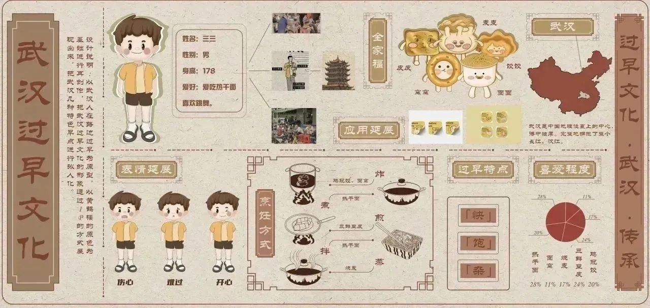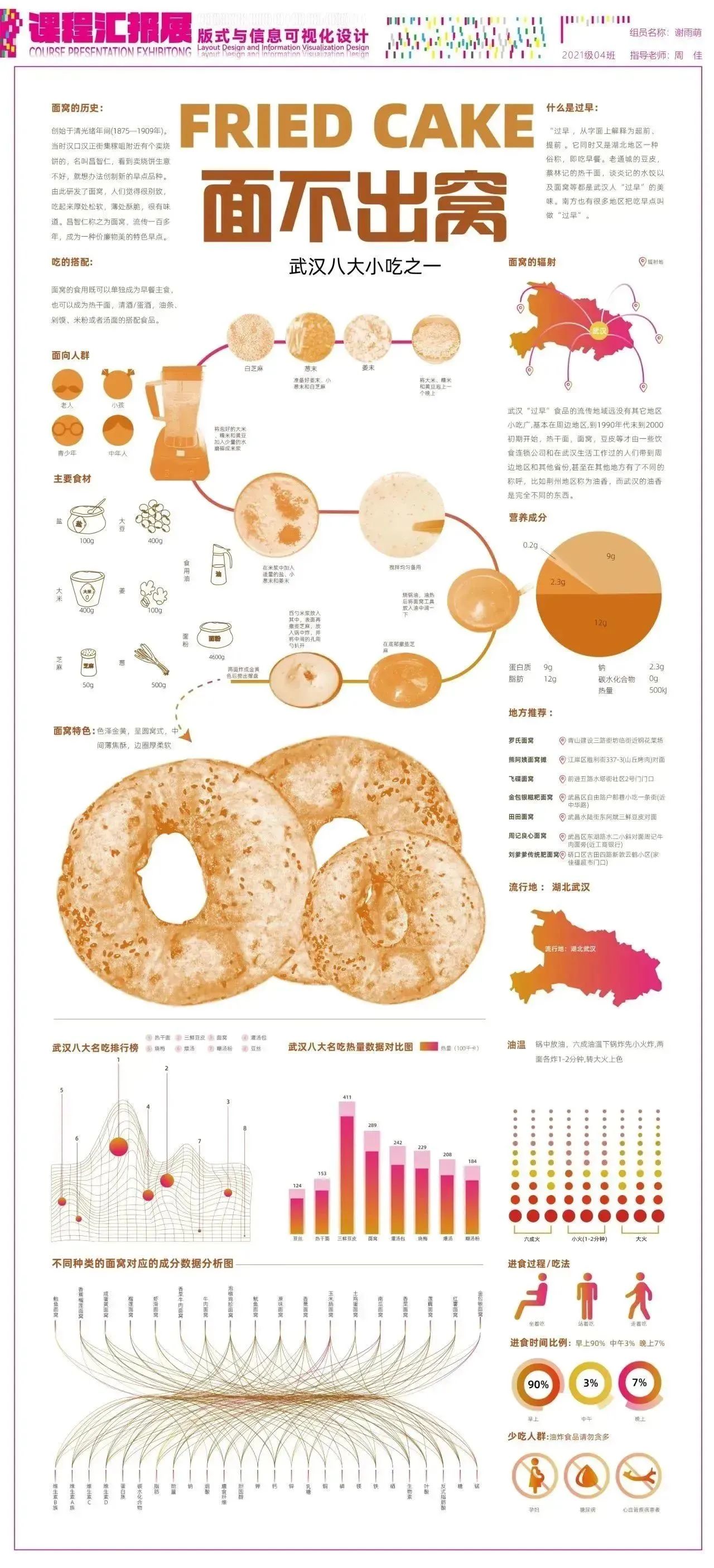 设计说明:该作品是对武汉八大小吃之一中的面窝展开设计,根据调研的有关内容,其中展示了面窝的制作流程、热量、特点,辐射、主要制作食材、营养成分。以及面窝在八大小吃里面的排行榜、进食比例、进食吃法和面向人群、武汉面窝的地方推荐,制作过程中的油温,和不同面窝的价格。把它们分别用图符或者图解表达其内容,颜色用渐变色过渡,丰富画面层次,图片处理成统一风格,使画面更协调。通过设计赋能使人们感受到美食带来的视觉盛宴,尽管是普通的美食也可以有许多值得探究的地方,不是一味追求高大尚的美食。