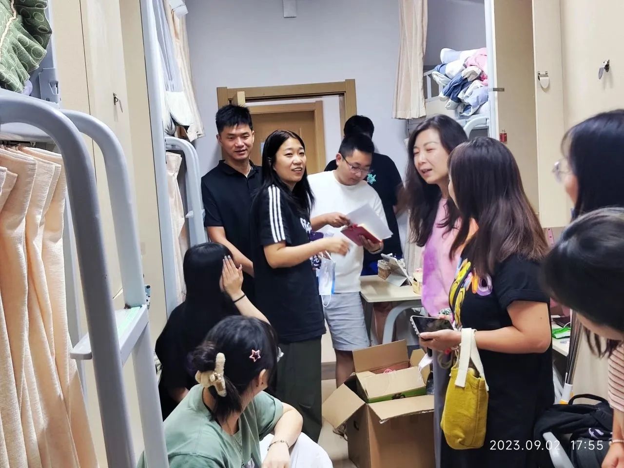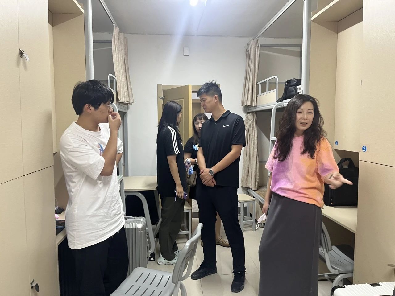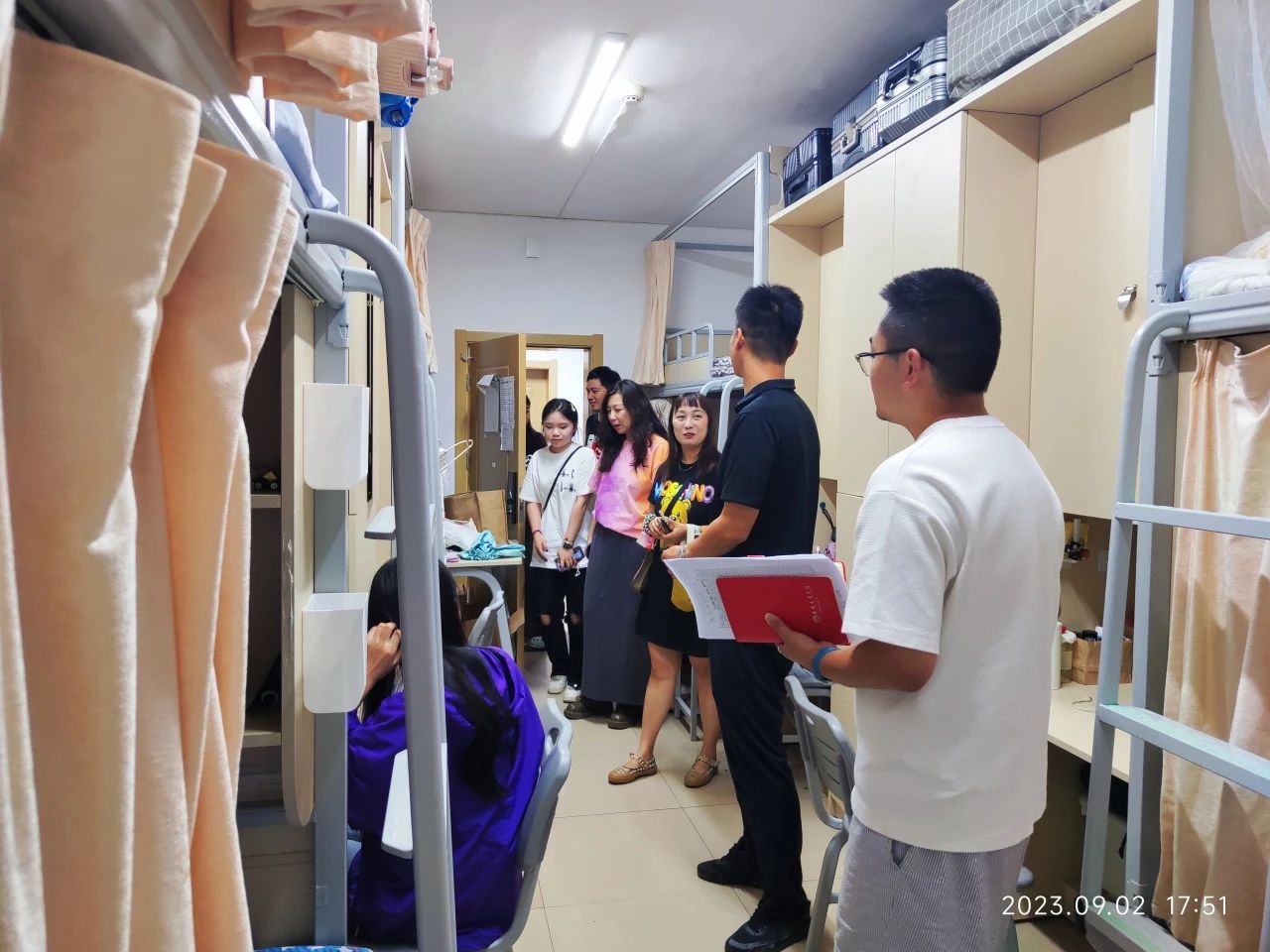 为进一步了解新生的入校状况,加强师生交流,切实解决员工所遇到的实际问题。9月2日晚,永利3044集团官网党总支书记吴茜、党总支副书记何高翔、分团委书记王识、班主任易靓、余玥瑶以及辅导员郑天朗、金浩然走访了2023级专升本新生的宿舍。