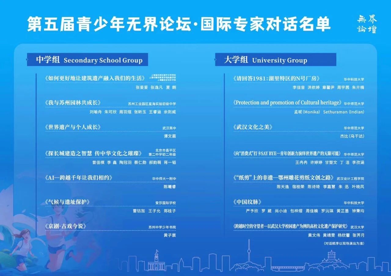 据悉,“青少年无界论坛”创始于2018年,至今已成功举办四届。本届论坛在共青团湖北省委员会、武汉市社会科学界联合会指导下,由联合国教科文组织工业遗产教席、联合国教科文组织亚太地区世界遗产培训与研究中心苏州分中心、共青团武汉市委员会、武汉市妇女联合会共同主办,武汉共享遗产研究会、武汉发布、武汉国际传播中心、中信建筑设计研究总院有限公司联合承办,并获得湖北省城市规划协会、武汉文化旅游集团有限公司、武汉市规划研究院、新世界发展(武汉)有限公司、钟祥市明显陵管理处等单位的支持。