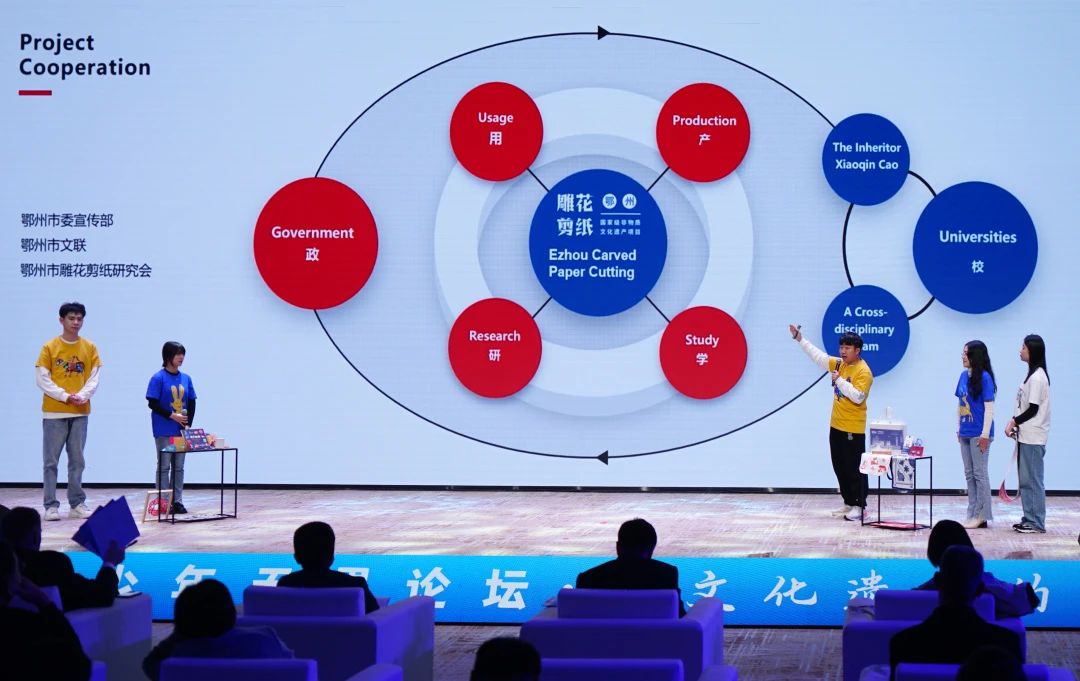 现场进入国际专家对话环节后,团队成员商务英语专业员工朱迅面对国际专家,镇定自若地回答了他们的问题,表达了团队对鄂州雕花剪纸的传承和文创之路发展的愿景。