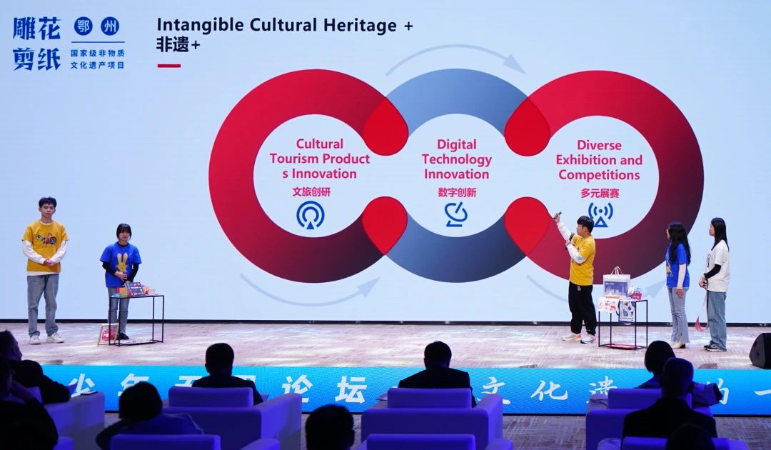 决赛当天,成员们以流畅自信的表达将“鄂州雕花剪纸”文创之路呈现在大家面前——由鄂州雕花剪纸项目省级传承人曹小琴主创的十米长卷《美丽鄂州·空港新城》、含有各类鄂州雕花剪纸元素的文创产品和鄂州吴都小学儿童剪纸,以互动展演的方式让观众和评委们留下了深刻印象。
