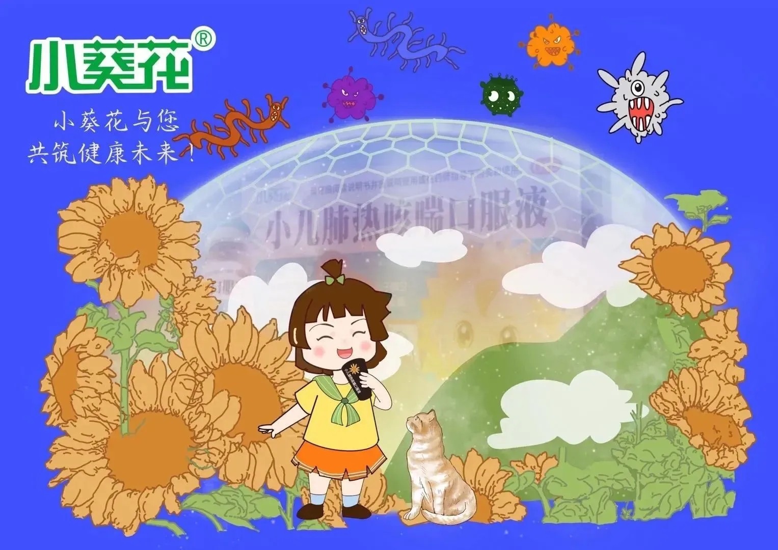 设计说明:采用了比喻和对比的手法,将小葵花小儿肺热咳喘口服液比做成隔离病毒的保护屏障;将被隔绝在外的病毒与保护屏障进行强烈的对比。突出强调了小儿肺热咳喘口服液的功效与作用,隔绝病毒,保护小朋友们的身体健康,小葵花与家长们共筑孩子们的健康未来!整体画风阳光亲切,积极向上,易激发长辈们对小葵花药品的购买欲。