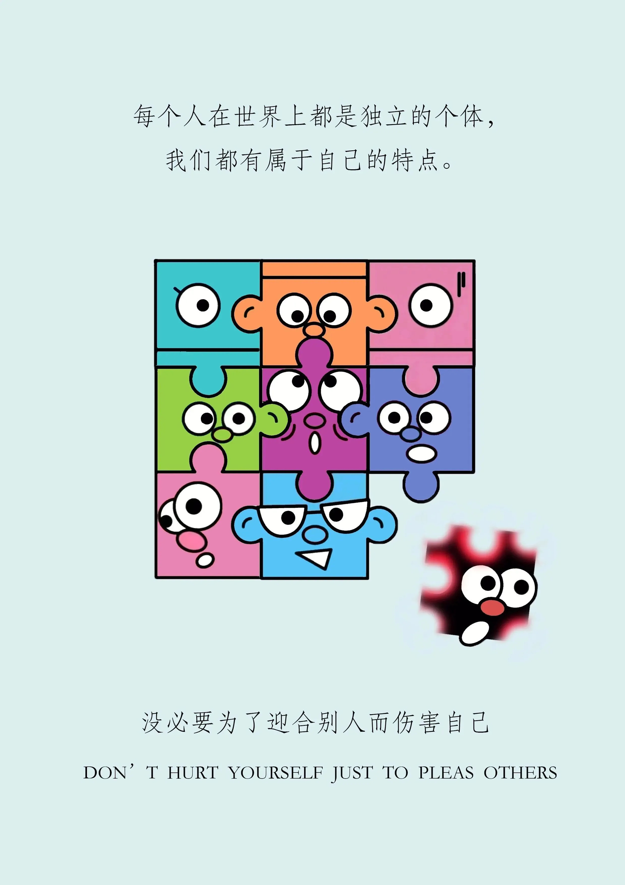 设计说明:每块不同图案的拼图代表着每个人,就像每个人在世界上都是独立的个体,我都有属于自己的"特点",黑色拼图与其他拼图不能拼合在一起,它强行让自己能够拼合进去导致自己遍体鳞伤,边角破碎,以此来表达我们没必要去为了迎合别人,融入别人,而去"伤害"自己,坏自己的"特点",每个人都是最好的。
