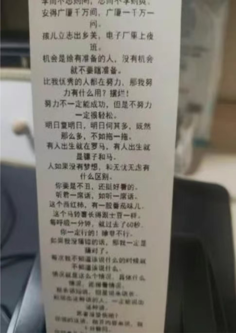 作品说明:废话文学是一种网络流行语,用来形容那些有点搞笑、看似说了话却又没有任何有用信息的言论和视频,往往用来形容文不对题、不知所云、模棱两可、打太极式的媒介信息。作品用打印机将其打印出来不追求深刻的思想内涵或精湛的艺术表达,而是以一种轻松、幽默甚至荒诞的方式,通过堆砌废话、玩弄文字游戏来达到娱乐或讽刺的效果。